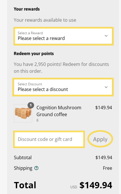 Choose a Reward – If you haven’t redeemed one yet, the second highlighted box will show you which rewards are available based on your points balance. Select the one you’d like to apply.